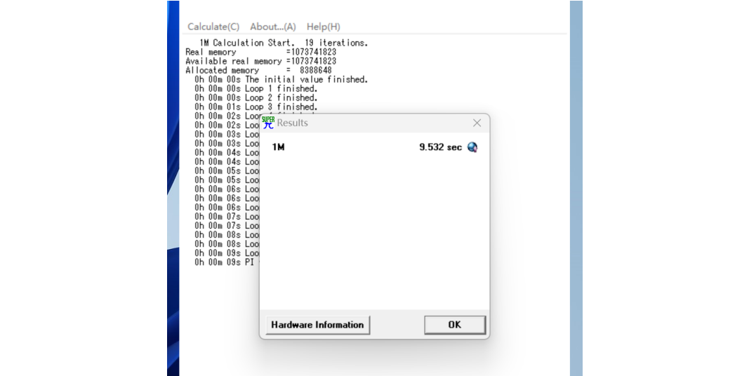 为了评估 CPU 的性能,南宫NG·28(中国)相信品牌力量使用了Super PI 1.1 进行了测试,软件以用时为参考成绩,花费时间越短代表计算性能越强。在本次测试中,Core i5-13400 处理器用时 9.532 秒完成了计算,属于当前中端处理器的主流水平,足以应对日常编码、分析和轻量建模任务。