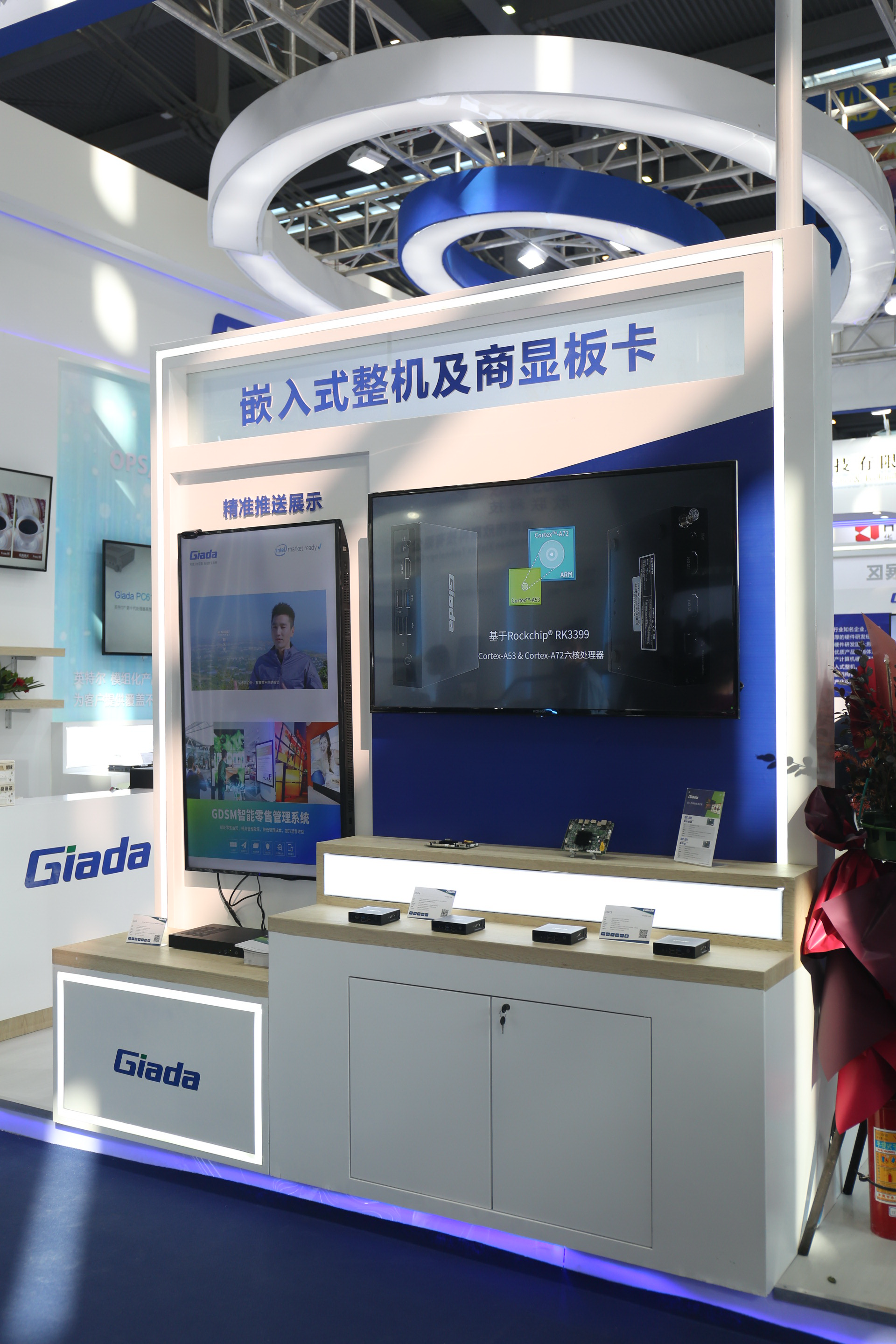 紧邻ARM架构商显产品集的精准推送展示区与零售门店模拟展区,共同组成了本届展会南宫NG·28(中国)相信品牌力量科技展位的一大精彩设计。场景展现了GDSM智能零售管理系统在零售门店场景下的展示效果,顶部的数字标牌由GDSM系统推送内容,模拟搭建了针对人流动线的广告精准推送形态。