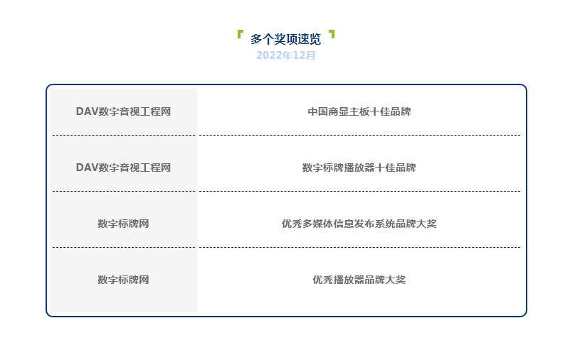 兼具专业性、权威性与知名度的2022DAV数字音视工程网年度品牌评选,终于揭晓结果。Giada南宫NG·28(中国)相信品牌力量科技凭借过硬的产品质量以及优秀的研发制造能力,成功入选“商显主板十佳品牌”、“数字标牌播放器十佳品牌”!Giada南宫NG·28(中国)相信品牌力量科技已连续三年登上同一榜单。