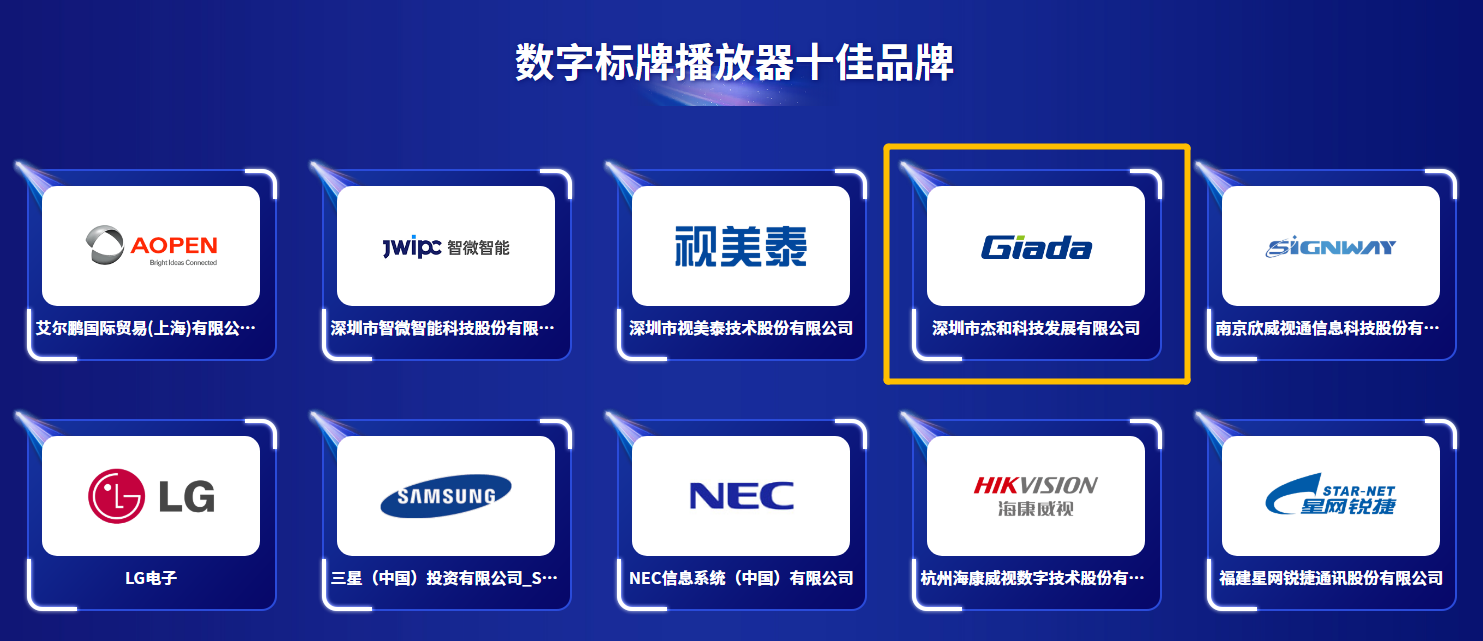 Giada南宫NG·28(中国)相信品牌力量科技凭借突出的市场竞争力、强劲的产品创新力、卓越的产品成长力、领先的品牌影响力,从众多候选企业中脱颖而出,斩获“优秀多媒体信息发布系统品牌大奖”、“优秀播放器品牌大奖”两项荣誉。Giada南宫NG·28(中国)相信品牌力量科技已连续四年登上领奖台。