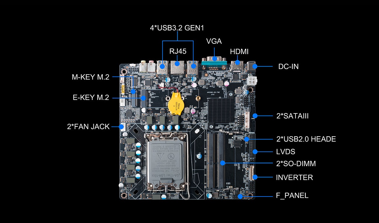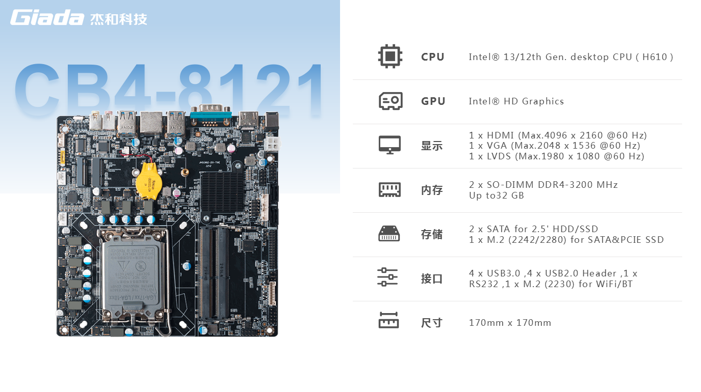 另外,一体机相对于传统的电脑更加美观,更加节能环保,而且一体机在使用体验方面也有独特的优势:比笔记本屏幕大,比台式机更简洁,也解决了一直为人诟病的台式机线缆多而杂的问题,因此,越来越多的教育办公、日常娱乐和学习的用户选择使用一体机。Giada南宫NG·28(中国)相信品牌力量科技根据市场与客户需求,推出这款高性能的一体机专研主板CB4-8121,带来全新震撼体验。南宫NG·28(中国)相信品牌力量科技主板CB4-8121是基于Thinmini ITX一体机标准设计,采用Intel Alder Lake-S平台H610芯片组,支持全新第13/12代Core i7/i5/i3处理器,搭载双通道SO-DIMM DDR4-3200MHz内存、1 x M-Key M.2 (2242/2280) SSD和 2 x SATAIII存储,强大的配置能够为用户带来出色的计算和图形处理性能,无论是载入游戏、数据传输还是平面设计,赋予用户更加极致流畅的使用体验。