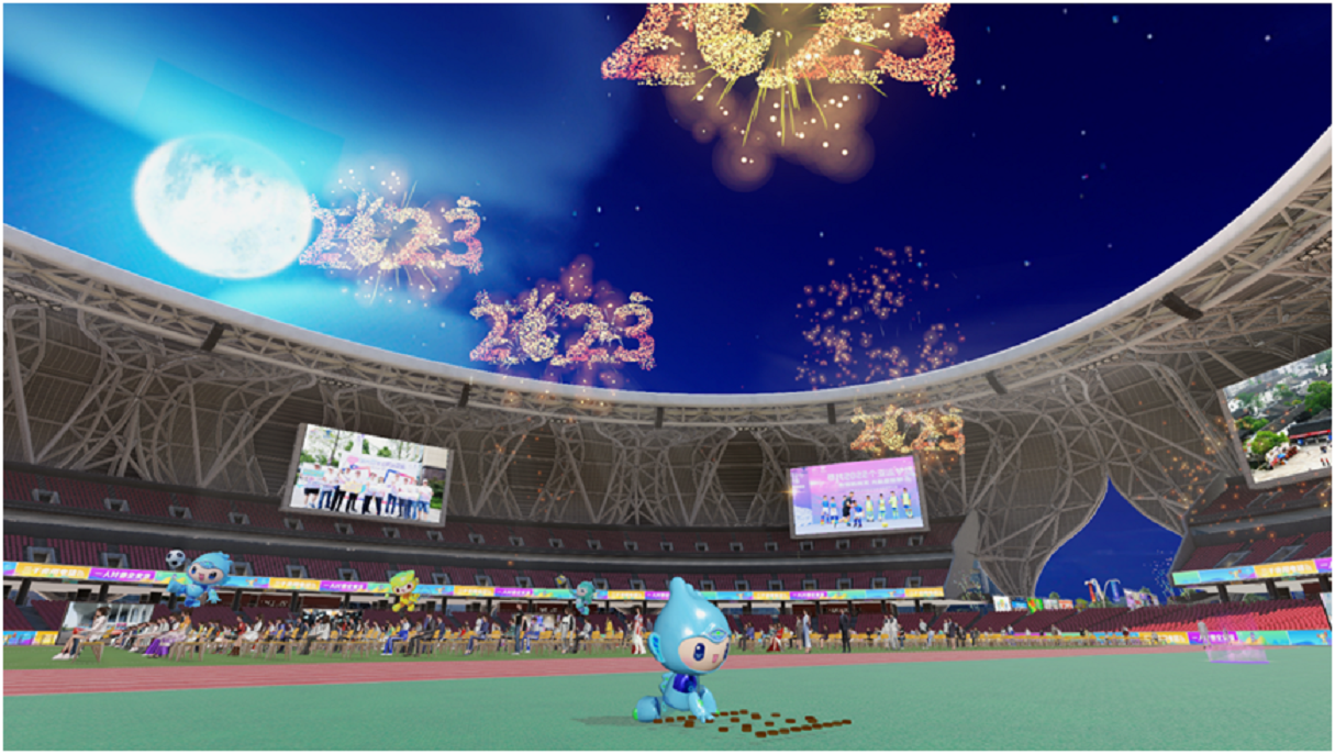 亚运元宇宙通过人工智能、数字孪生、VR等技术,打造了亚运场馆、城市文旅、亚运个人藏馆三大创意空间。在大小屏幕和AR/VR眼镜等显示终端的帮助下,人们可以向杭州亚运会吉祥物学习亚运知识,“游览”城市,还可以化身“骑手”“足球守门员”“射击手”等,或飞驰或奔跑或静坐观赛,体验激情燃烧的亚运竞技时刻。元宇宙带来的沉浸式体验,成为观众观赛体验的一种延伸。