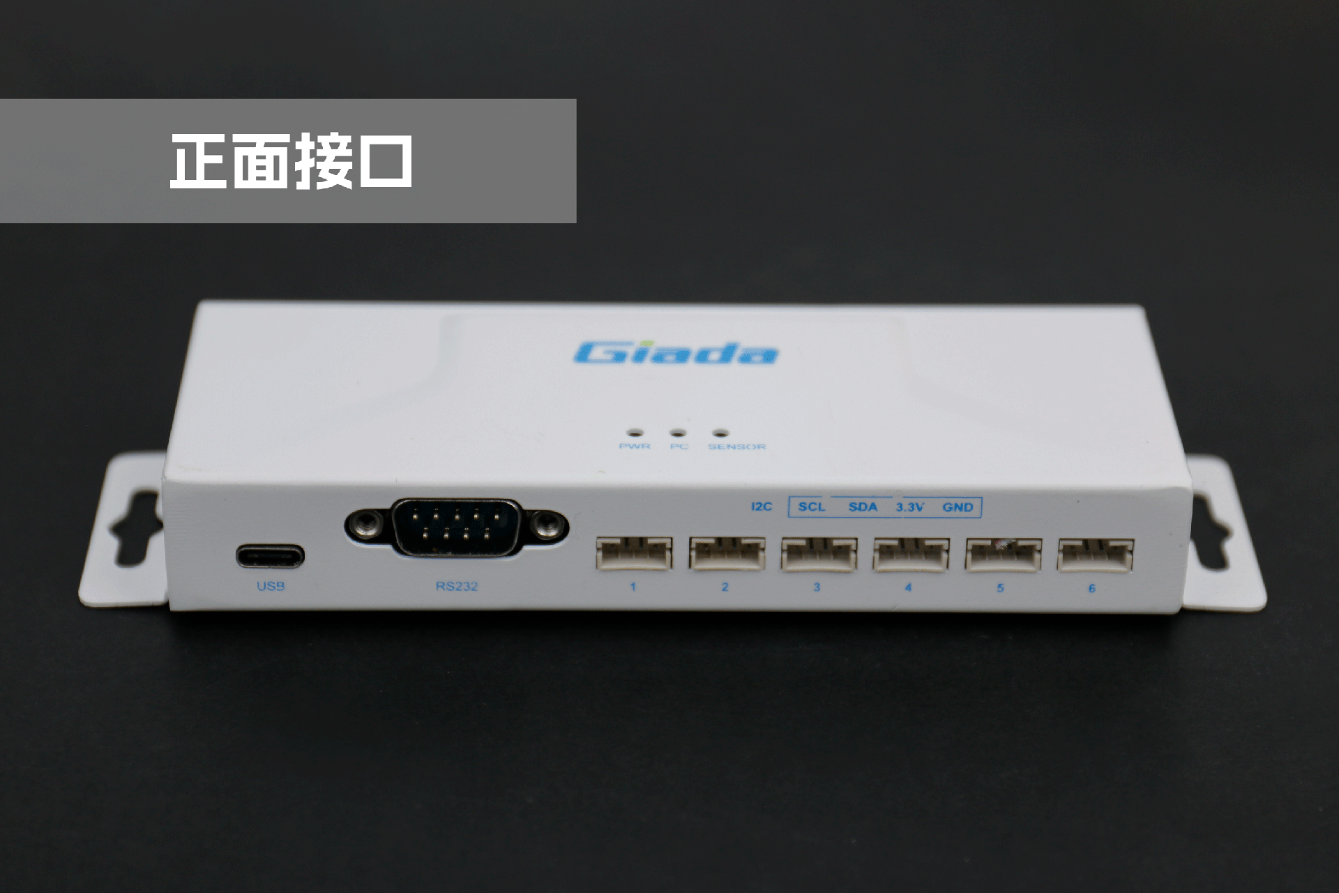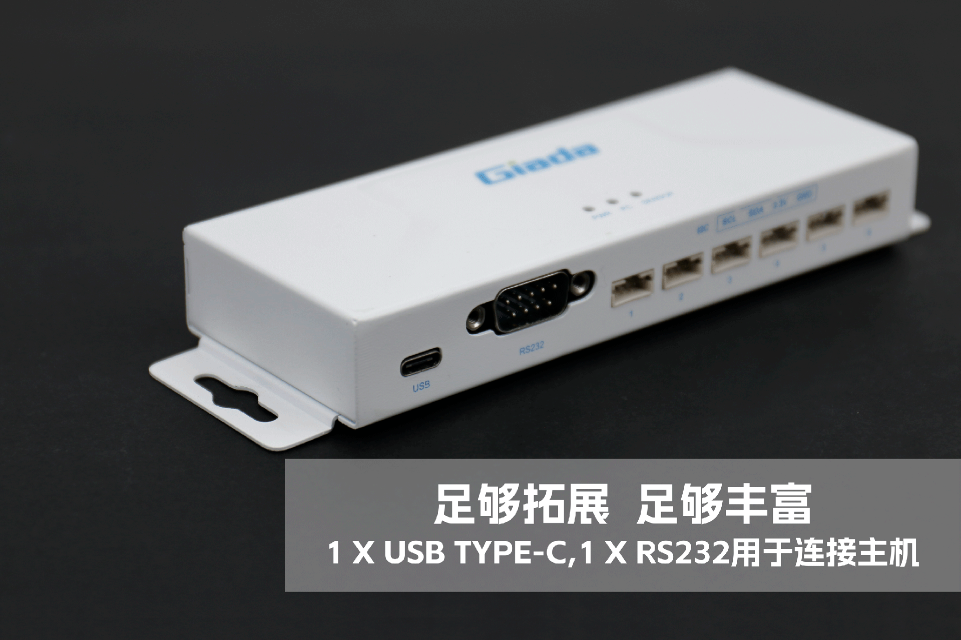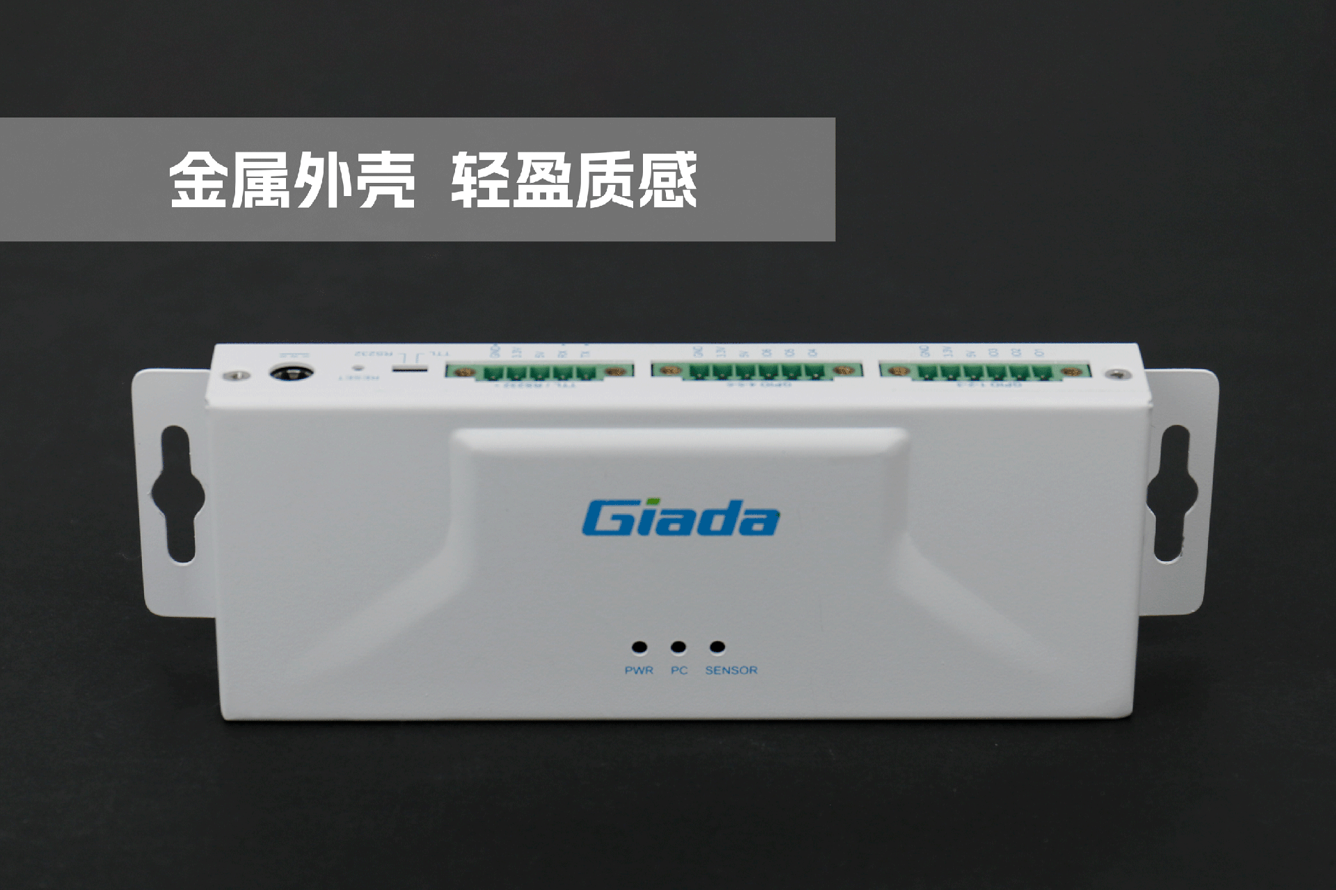 南宫NG·28(中国)相信品牌力量物联网拓展坞RD01外部为白色,顶部印制南宫NG·28(中国)相信品牌力量Giada的彩色logo,外壳采用金属材质,左右两侧设计同材质挂耳,可以方便用户固定设备。