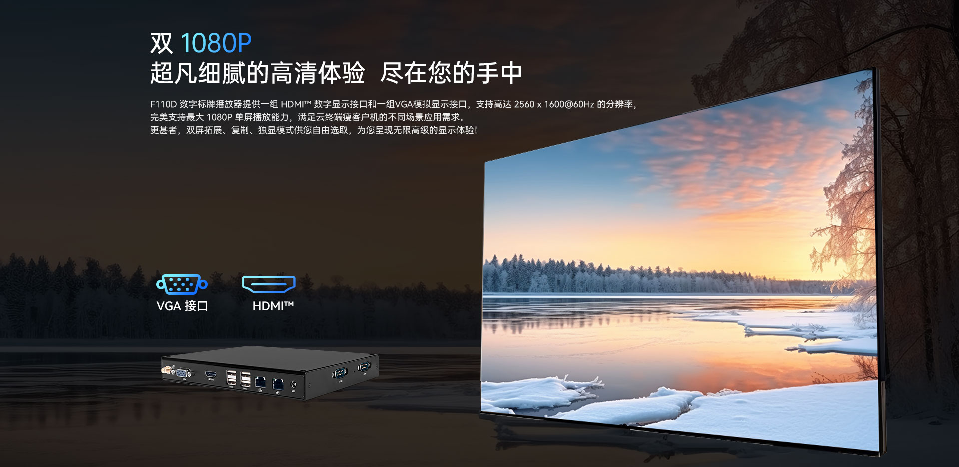 提供1x VGA+1x HDMI双视频接口输出